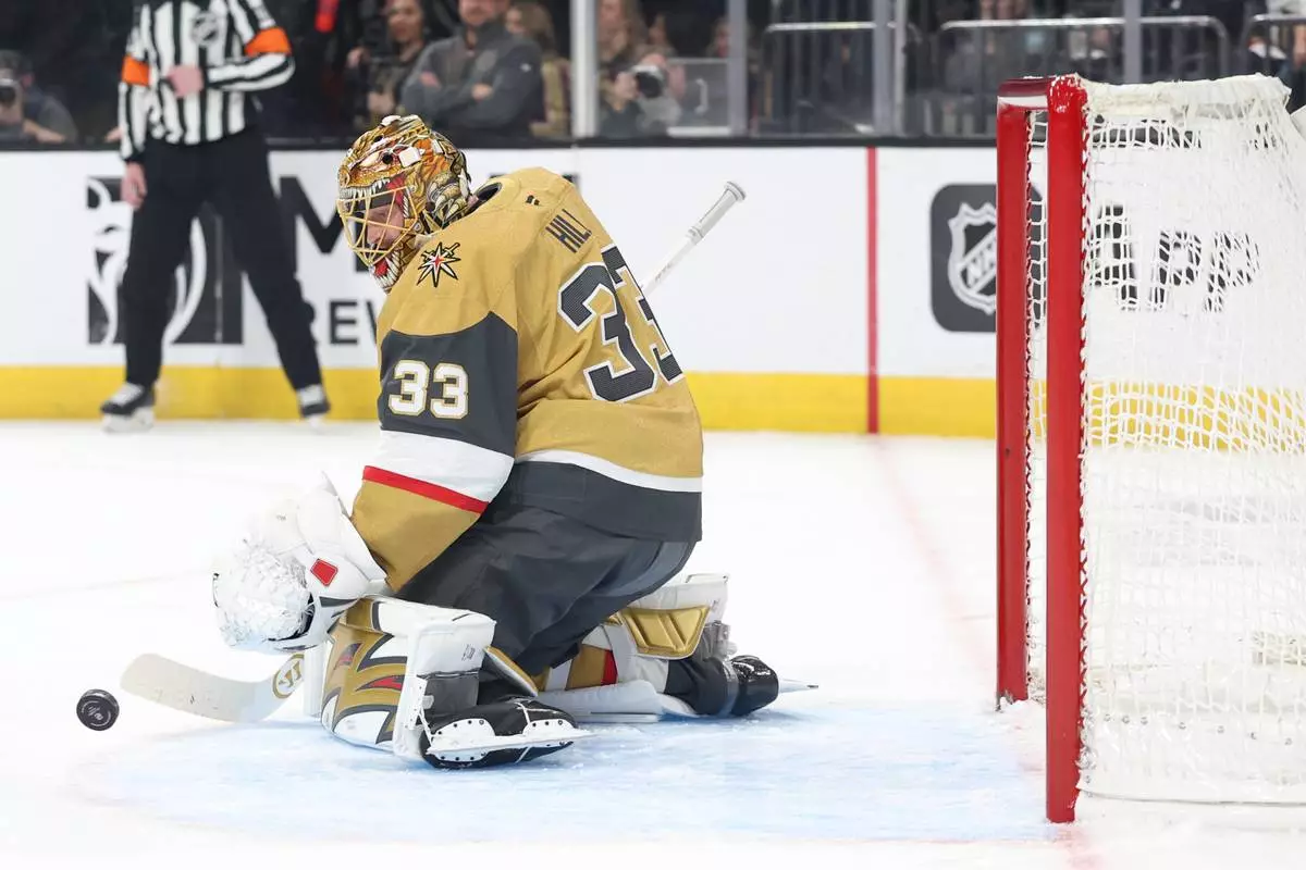 Vegas' Adin Hill made 32 saves for his 100th career victory, his most stops since having 34 on March 15, 2025, against Buffalo.