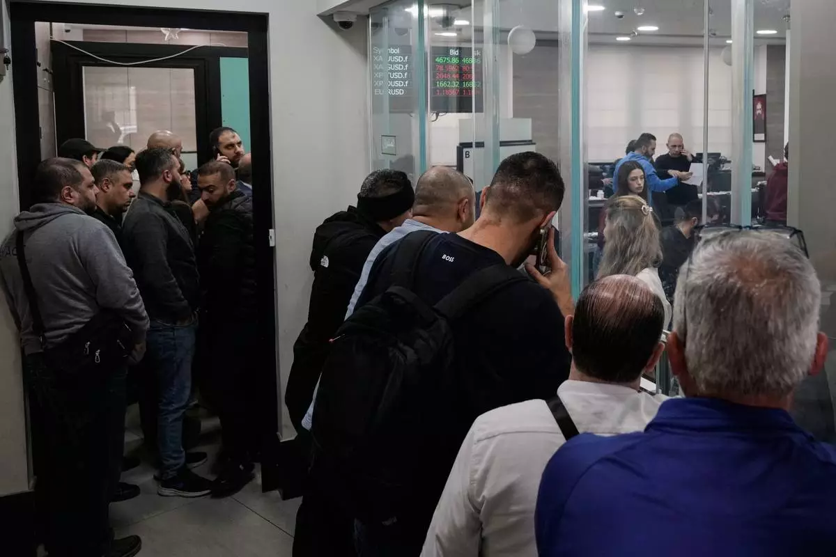 People wait in line to buy gold and silver ounces at a gold and silver trader in the Beirut suburb of Bourj Hammoud, Lebanon, Monday, Feb. 2, 2026. (AP Photo/Bilal Hussein)