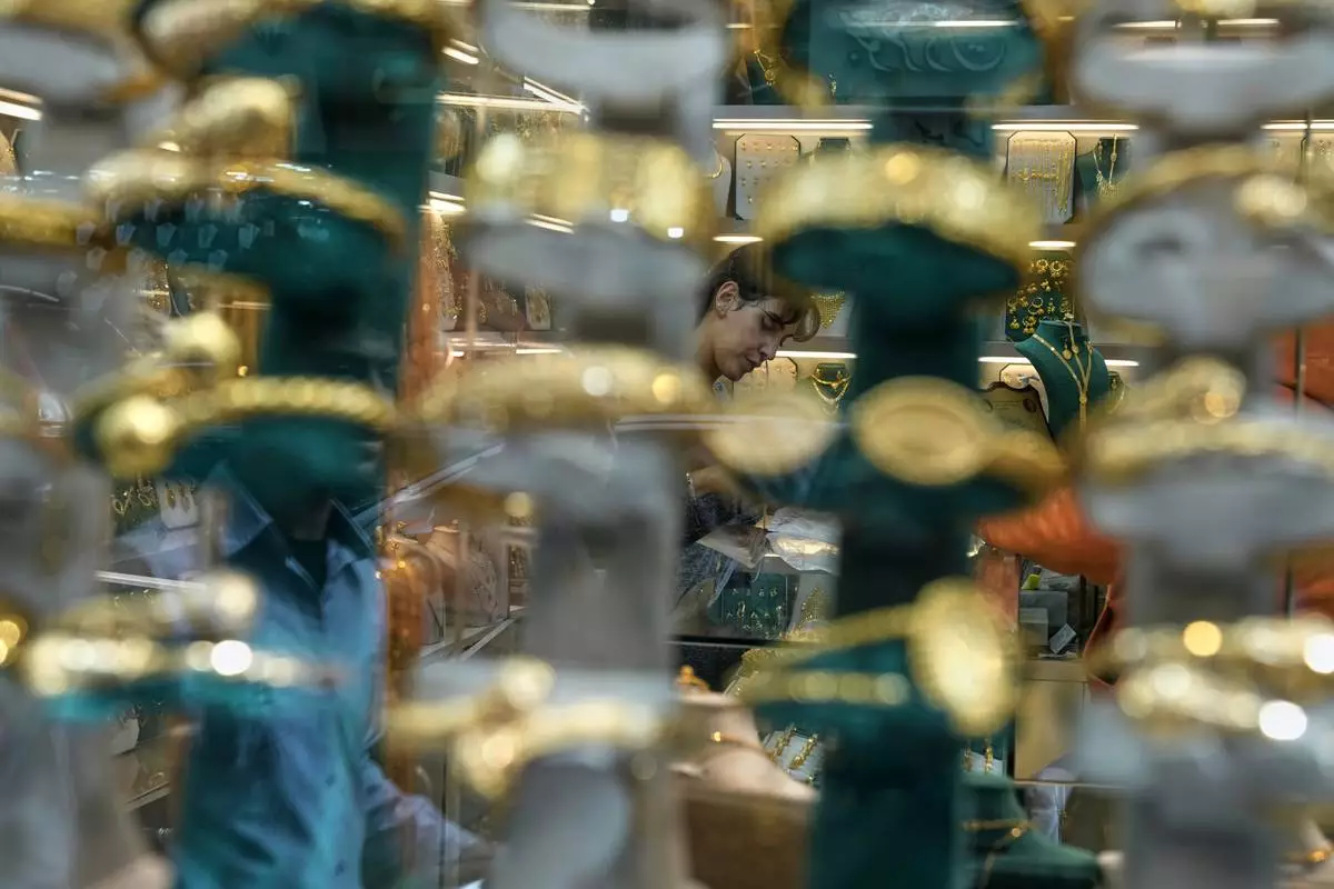 A Lebanese jeweler arranges gold ornaments at his shop's storefront in the Beirut suburb of Bourj Hammoud, Lebanon, Monday, Feb. 2, 2026. (AP Photo/Bilal Hussein)