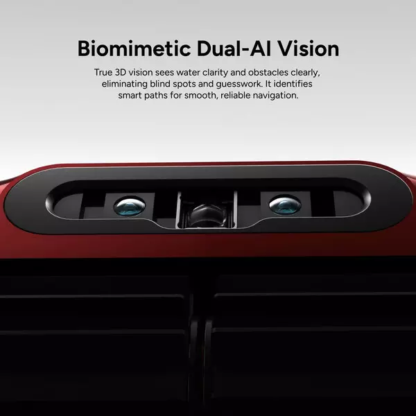 The pool cleaner'core advantage lies in its Biomimetic Dual-Vision system. Unlike traditional sensors, this system utilizes the parallax principle to generate true 3D depth data, identifying stairs, slopes, and even 40cm shallow water tanning ledges with precision. This visual input feeds the Vision Intelligence system, driving the industry-first AI Target System. If debris is detected in the same area after multiple passes, the system automatically engages Turbo Mode, instantly unleashing triple suction (300%) to drive power into the extreme zone for the toughest debris.