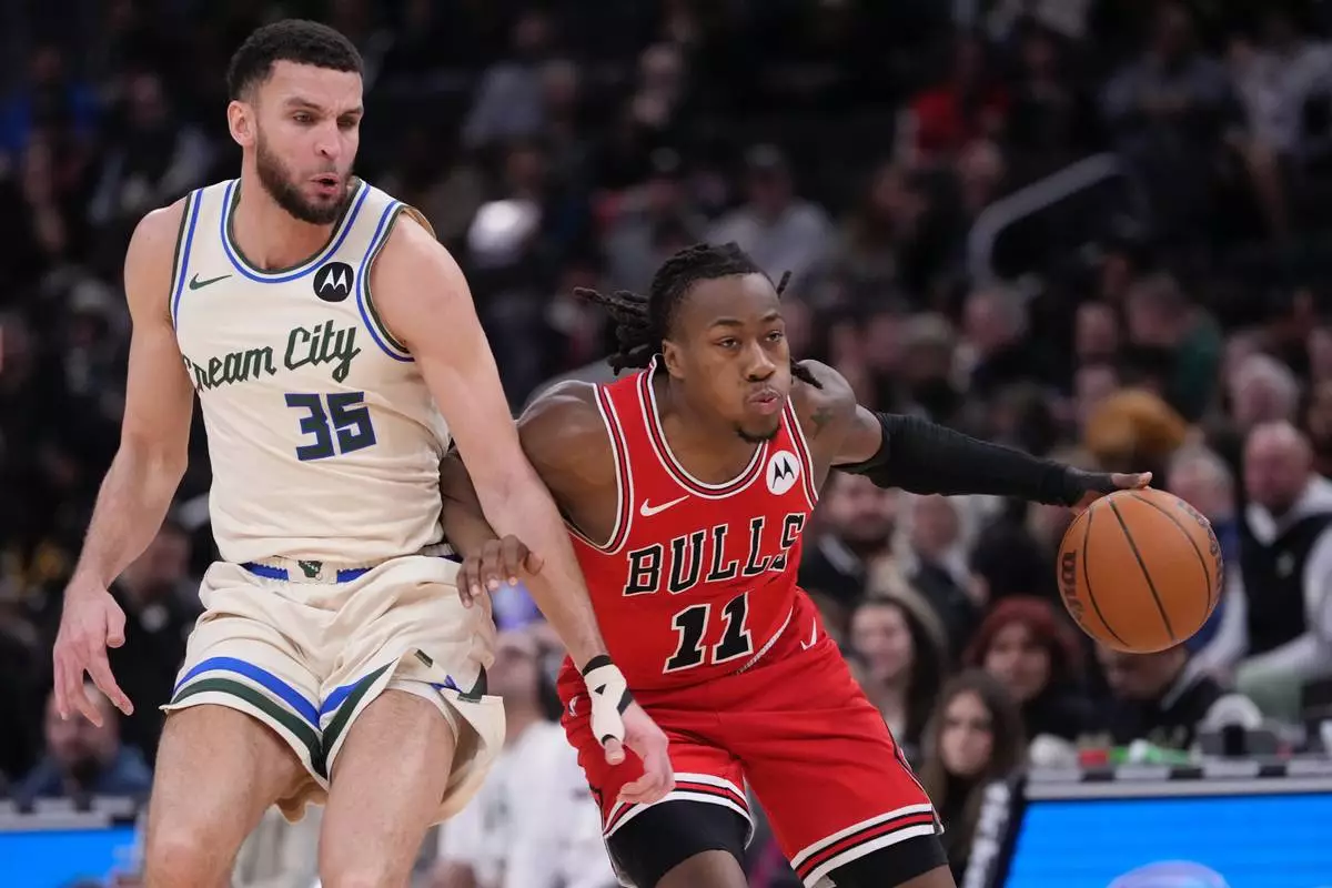 Chicago Bulls' Ayo Dosunmu gets past Milwaukee Bucks' Pete Nance during the first half of an NBA basketball game Tuesday, Feb. 3, 2026, in Milwaukee. (AP Photo/Morry Gash)