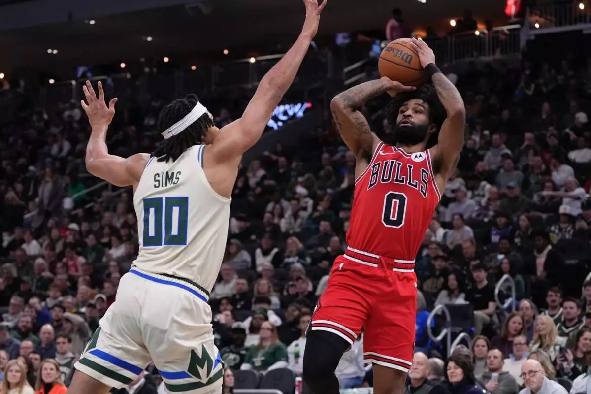 Chicago Bulls' Coby White shoots over Milwaukee Bucks' Jericho Sims during the first half of an NBA basketball game Tuesday, Feb. 3, 2026, in Milwaukee. (AP Photo/Morry Gash)