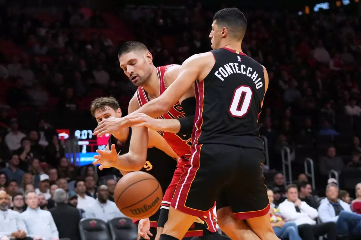 Chicago Bulls center Nikola Vucevic, center loses control of the ball as Miami Heat forward Simone Fontecchio (0) defends during the second half of an NBA basketball game, Sunday, Feb. 1, 2026, in Miami. (AP Photo/Lynne Sladky)