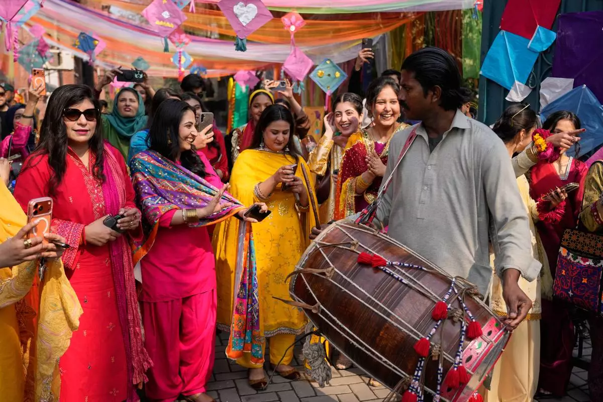 Students dance on traditional drum beat during a gathering to celebrate three-day kite flying festival 'Basant' at their university campus, in Lahore, Pakistan, Friday, Feb. 6, 2026. (AP Photo/K.M. Chaudary)