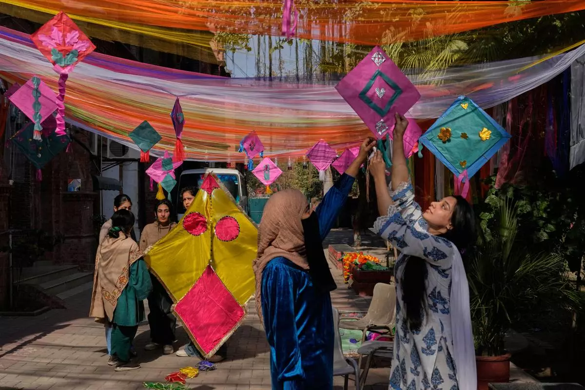 Students decorate their university campus with variety of kites ahead of the upcoming three-day kite flying festival 'Basant' celebrations, in Lahore, Pakistan, Thursday, Feb. 5, 2026. (AP Photo/K.M. Chaudary)