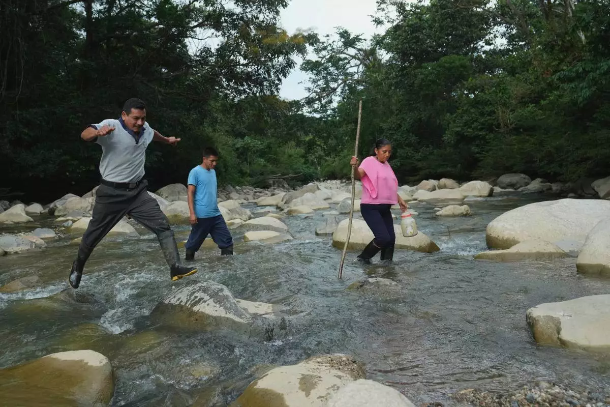 Ramon Pucha, his son Jhoel, and his wife Marlene cross the Alto Ila River during an expedition to search for native seeds to grow on their farm, where they preserve species and share seedlings with neighboring communities in an effort to protect biodiversity, in Alto Ila, in Ecuador's Amazon region, Tuesday, Feb. 3, 2026. (AP Photo/Dolores Ochoa)
