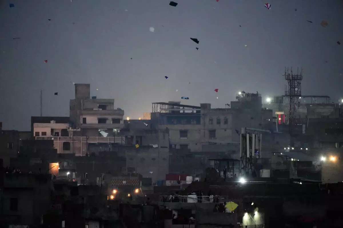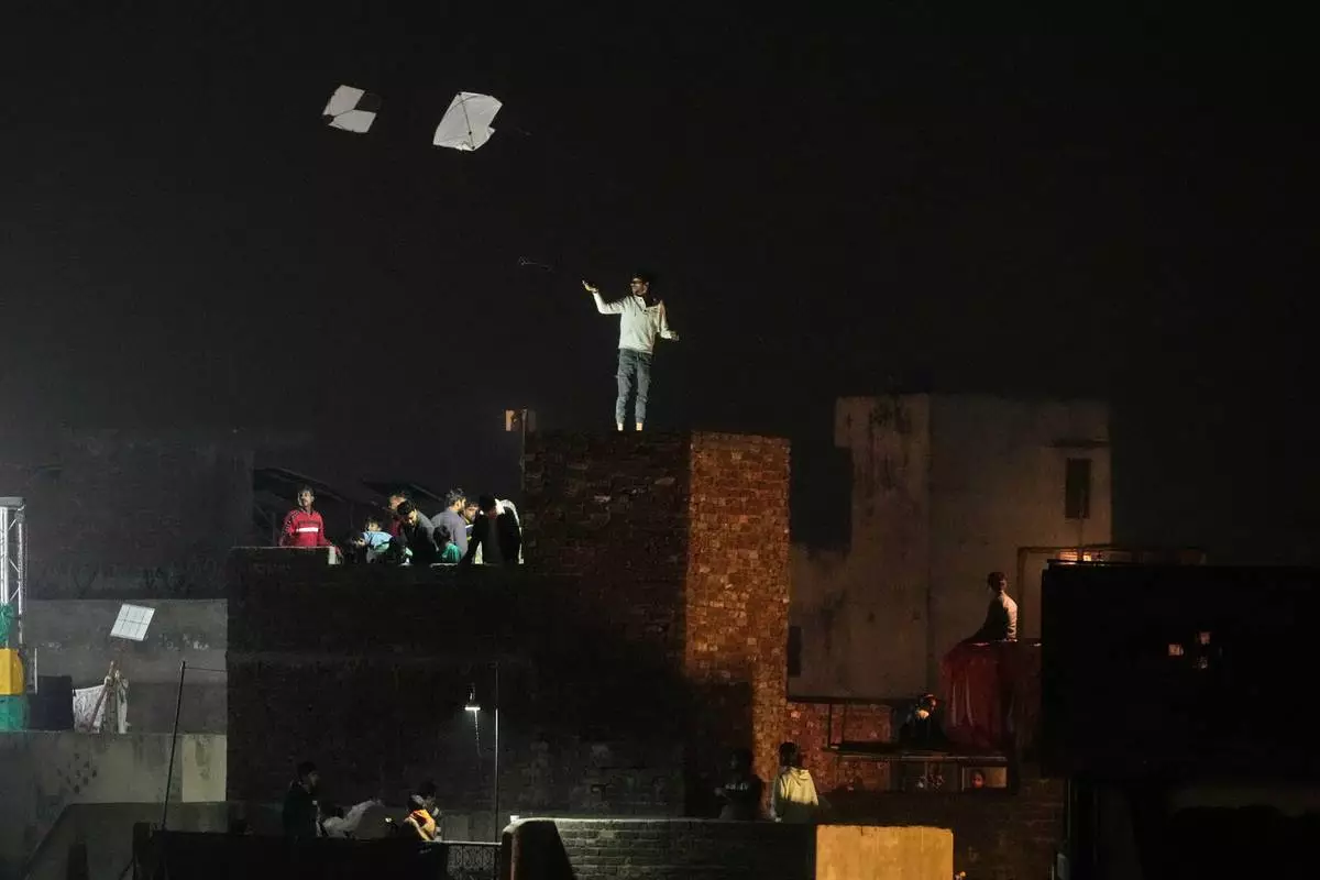 People gather on their decorated rooftops to celebrate the Basant kite flying festival in Lahore, Pakistan, late Friday, Feb. 6, 2026. (AP Photo/K.M. Chaudary)