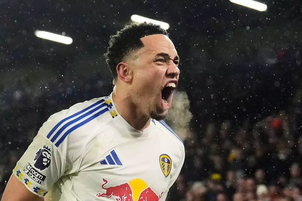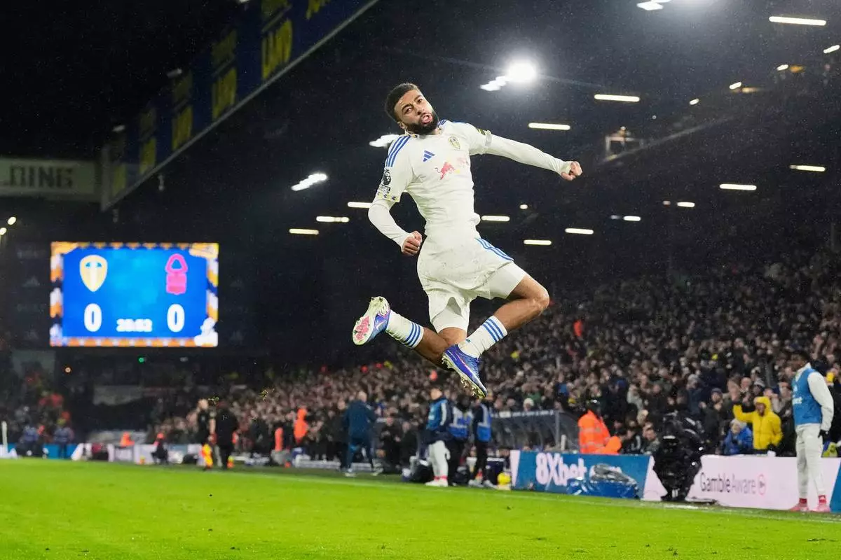 Leeds United's Jayden Bogle celebrates scoring their first goal during the English Premier League soccer match between Leeds United and Nottingham Forest in Leeds, England, Friday Feb. 6, 2026. (Danny Lawson/PA via AP)