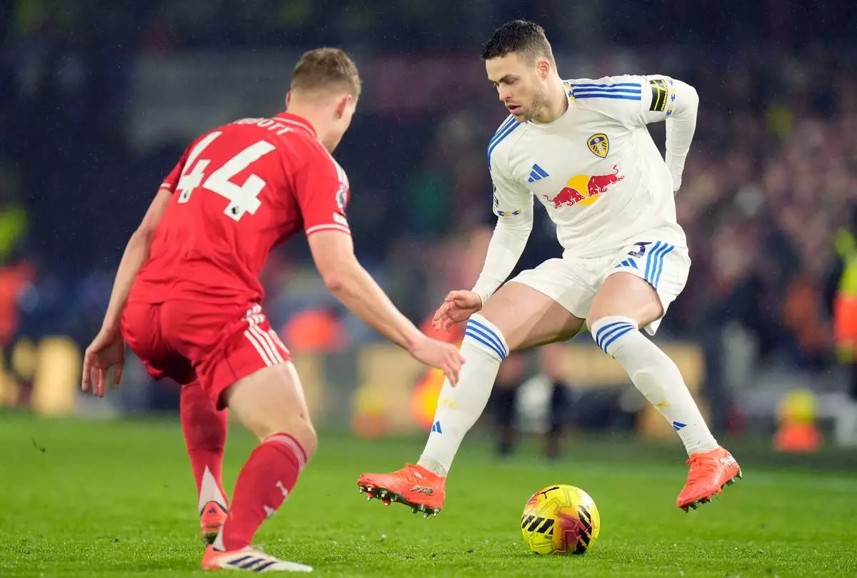 Leeds United's Gabriel Gudmundsson, right, controls the ball as Nottingham Forest's Zach Abbott moves in during the English Premier League soccer match between Leeds United and Nottingham Forest in Leeds, England, Friday Feb. 6, 2026. (Danny Lawson/PA via AP)