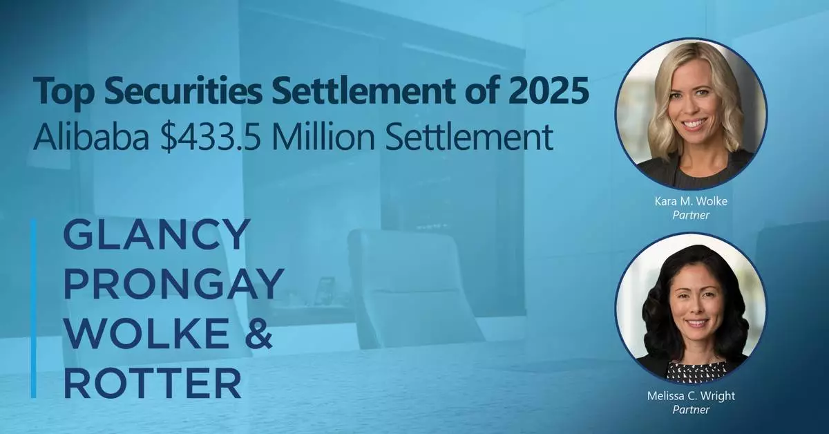 Glancy Prongay Wolke & Rotter LLP (GPWR) is proud to announce that the Firm, as sole lead counsel for Alibaba investors, attained the highest securities class action settlement of 2025, according to prominent national economic consulting firm, NERA. Spearheaded by partners Kara Wolke and Melissa Wright, GPWR leveraged its deep experience and tenacious advocacy into a $433.5 million settlement for the benefit of Alibaba’s investors. Injured by fraud or corporate wrongdoing? Let GPWR put its skills to work for you.