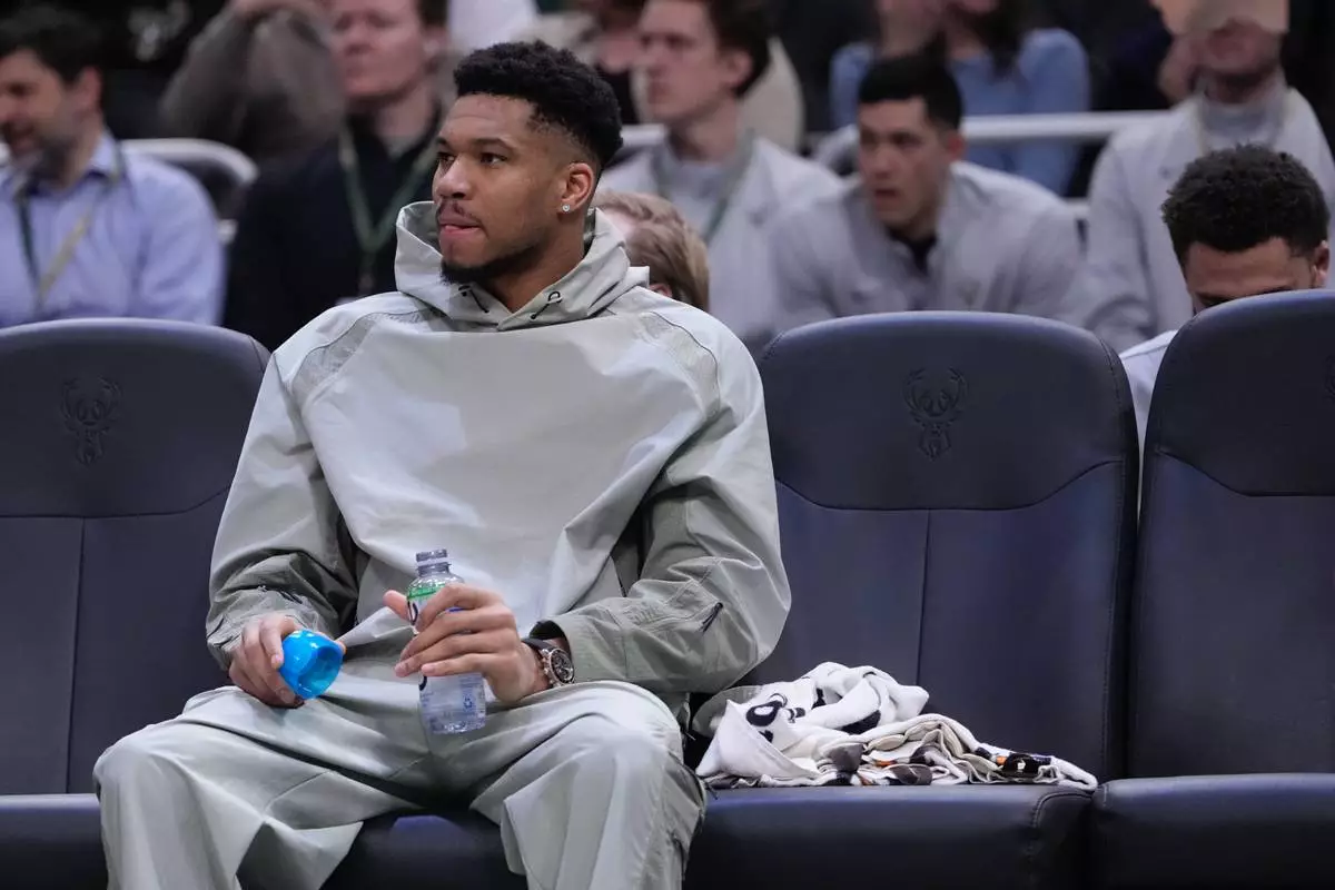 Milwaukee Bucks' Giannis Antetokounmpo sits on the bench during the first half of an NBA basketball game Wednesday, Feb. 4, 2026, in Milwaukee. (AP Photo/Morry Gash)