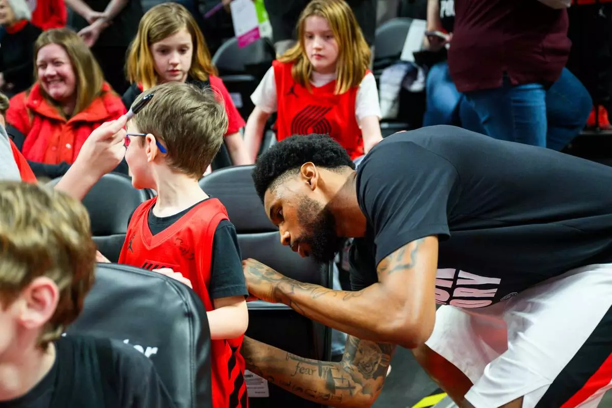 Portland Trail Blazers guard Blake Wesley, right, gives autographs during warmups before an NBA basketball game against the Memphis Grizzlies, Friday, Feb. 6, 2026, in Portland, Ore. (AP Photo/Molly J. Smith)