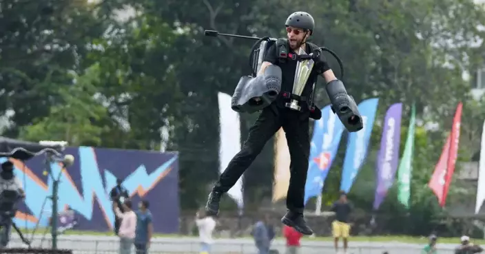 An acrobat flies with the T20 World Cup cricket trophy around the stadium before the start of the opening match between Netherlands and Pakistan in Colombo, Sri Lanka, Saturday, Feb. 7, 2026. (AP Photo/Eranga Jayawardena)