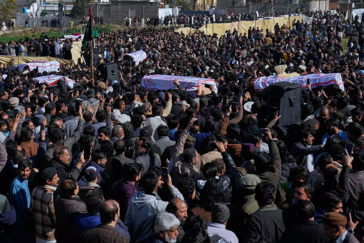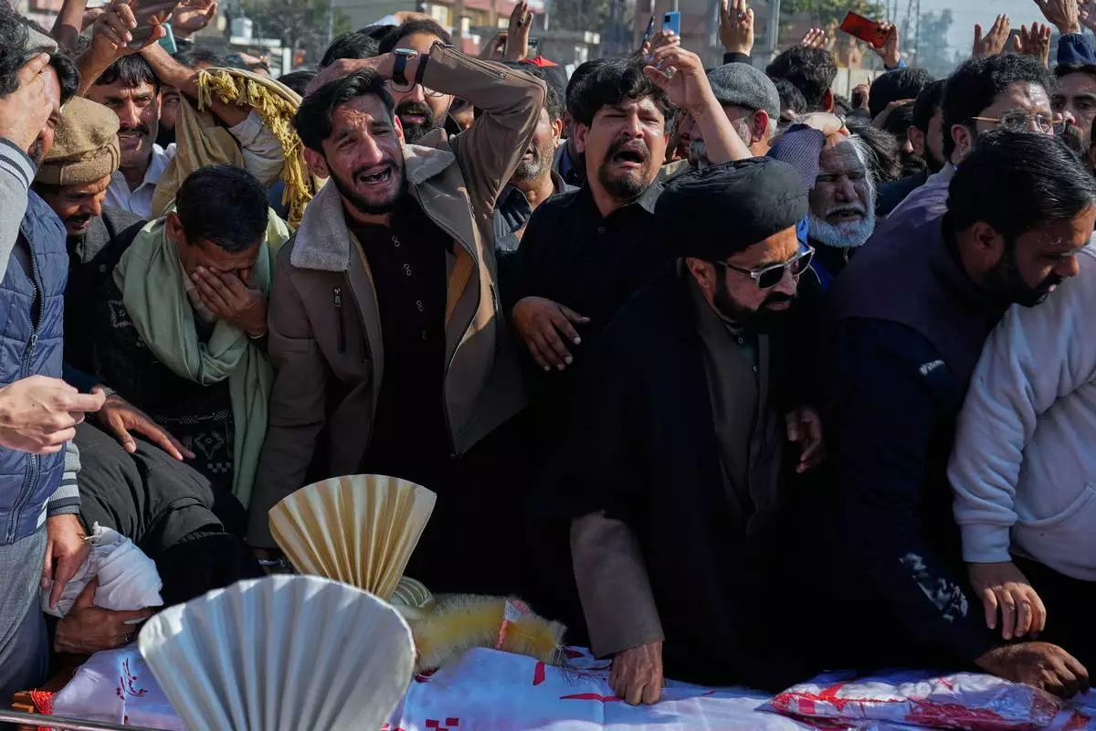 People mourn over coffins of their relatives, who were killed in Friday's suicide bombing inside a Shiite mosque, in Islamabad, Pakistan, Saturday, Feb. 7, 2026. (AP Photo/Anjum Naveed)