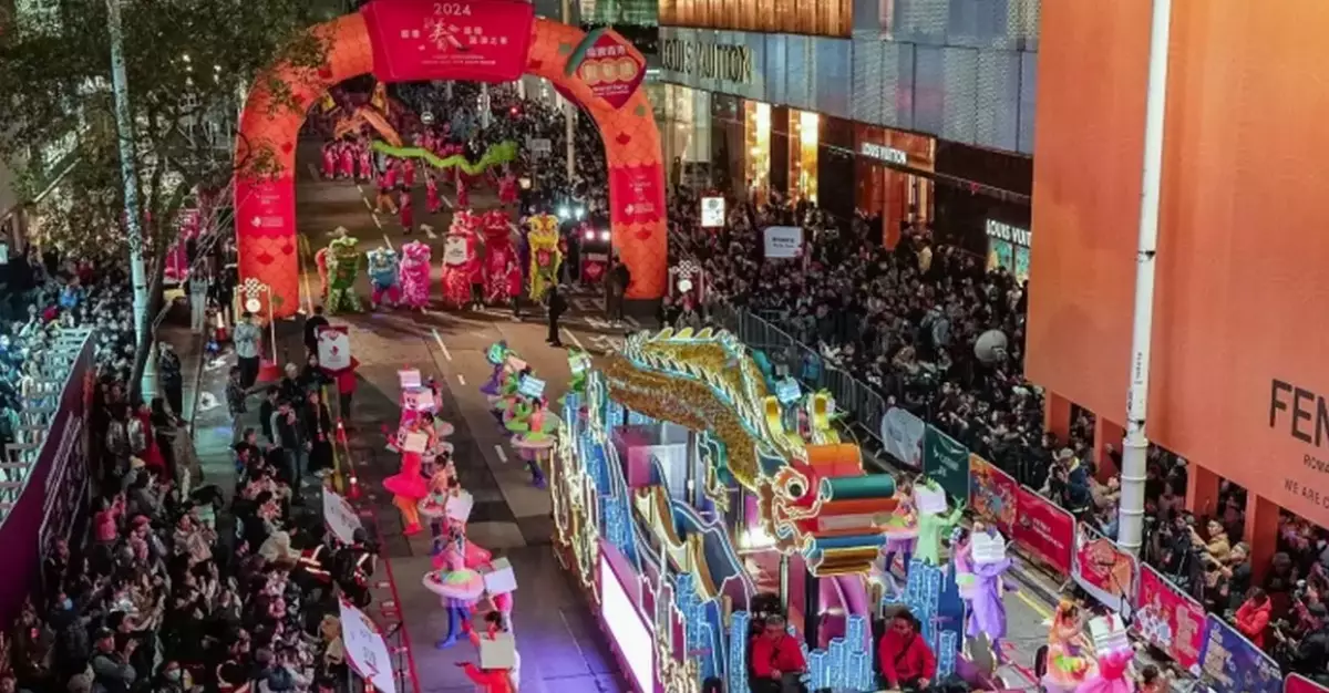 The "Cathay International Chinese New Year Night Parade" will officially begin at 8:00 pm on February 17th. The parade will start at the Hong Kong Cultural Centre Piazza in Tsim Sha Tsui, proceed along Canton Road, Haiphong Road and Nathan Road, and finish at the Sheraton Hong Kong Hotel. The entire procession will last approximately 1 hour and 30 minutes.