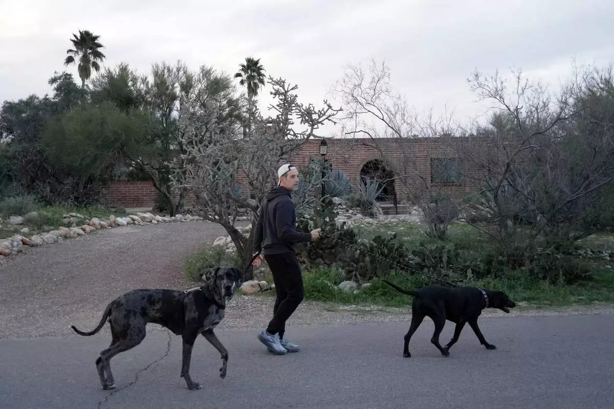 A man walks his dogs passed Nancy Guthrie’s home in the early morning of Saturday, in Tucson, Ariz. Feb. 7, 2026. (AP Photo/Ty ONeil)