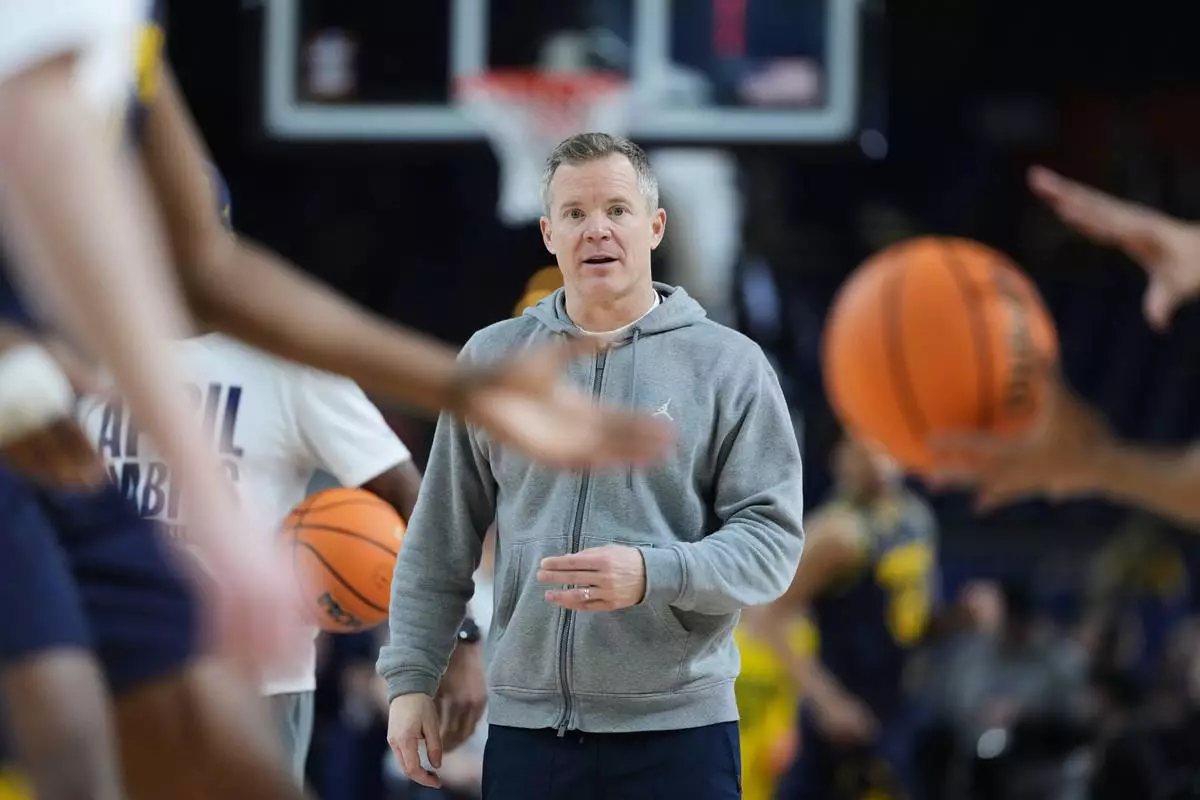 Michigan head coach Dusty May watches during practice ahead of an NCAA college basketball tournament semifinal game against Arizona at the Final Four, Friday, April 3, 2026, in Indianapolis. (AP Photo/Michael Conroy)