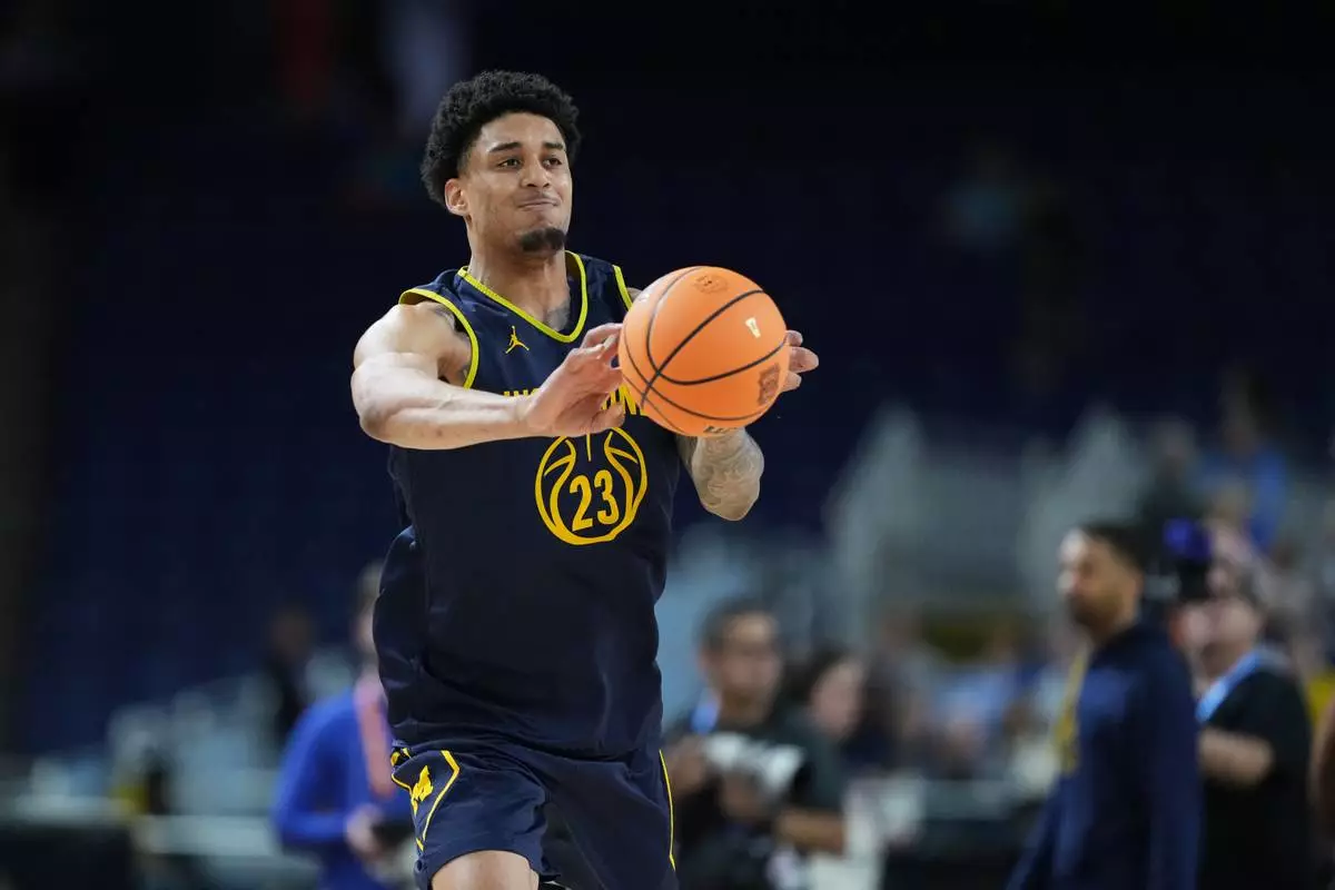 Michigan's Yaxel Lendeborg passes during practice ahead of an NCAA college basketball tournament semifinal game against Arizona at the Final Four, Friday, April 3, 2026, in Indianapolis. (AP Photo/Michael Conroy)
