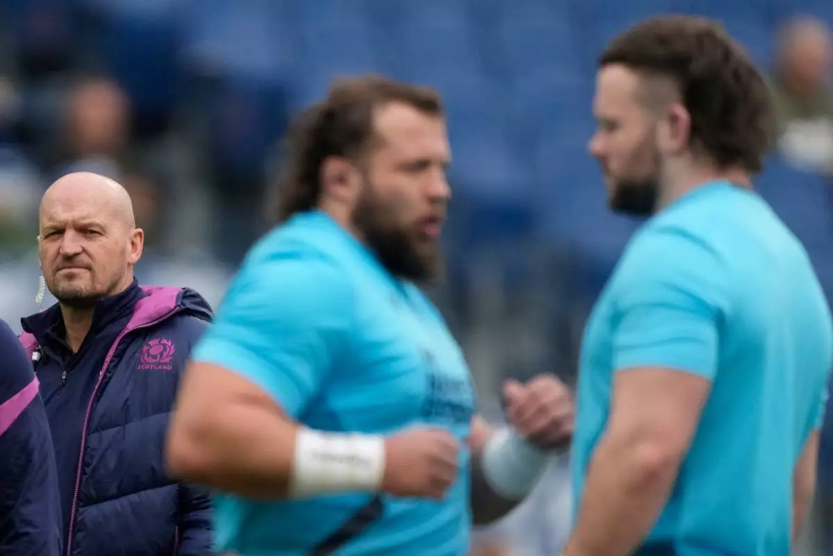 Scotland's coach Gregor Townsend, left, directs his team's warm up before the Six Nations Rugby match between Italy and Scotland at Rome's Olympic Stadium, Saturday, Feb. 7, 2026. (AP Photo/Gregorio Borgia)