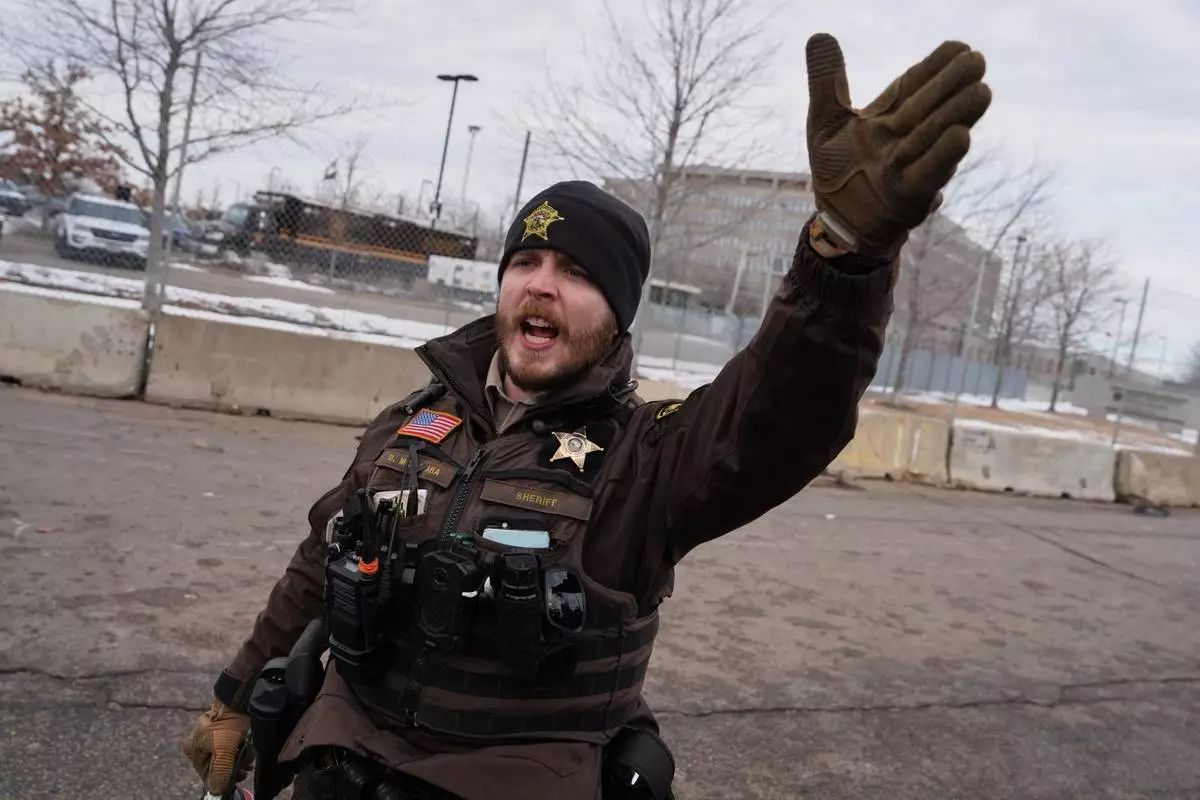 A sheriff's deputy yells at counterprotesters demonstrating against Jake Lang on Saturday, Feb. 7, 2026, in Minneapolis. (AP Photo/Ryan Murphy)