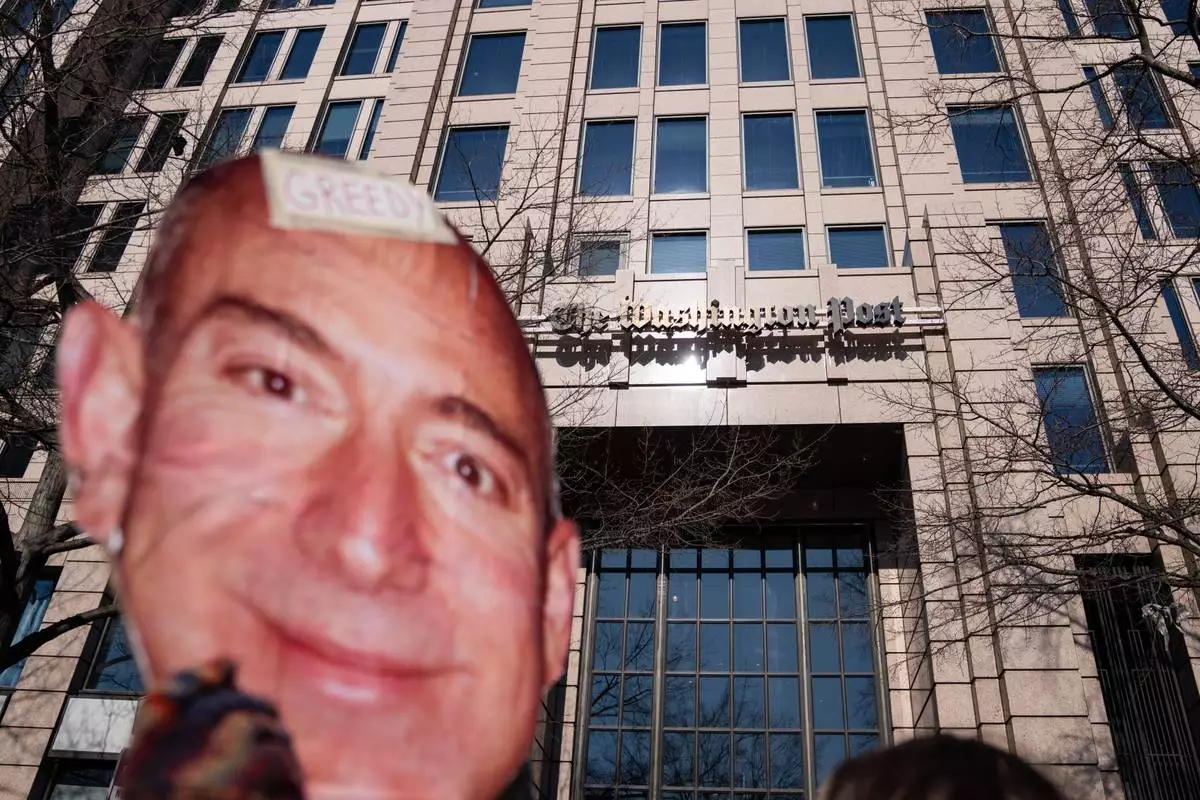 A protester holds a cutout of Jeff Bezos' face outside of the Washington Post office following a mass layoff, Thursday, Feb. 5, 2026, in Washington. (AP Photo/Allison Robbert)
