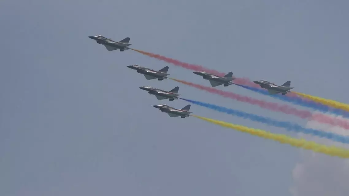 At 11:00 on Sunday, six J-10 fighters streaked across the sky. Flying in an ultra-tight formation, they trailed vibrant ribbons of red, yellow, and blue smoke, painting a spectacular display above the airport.