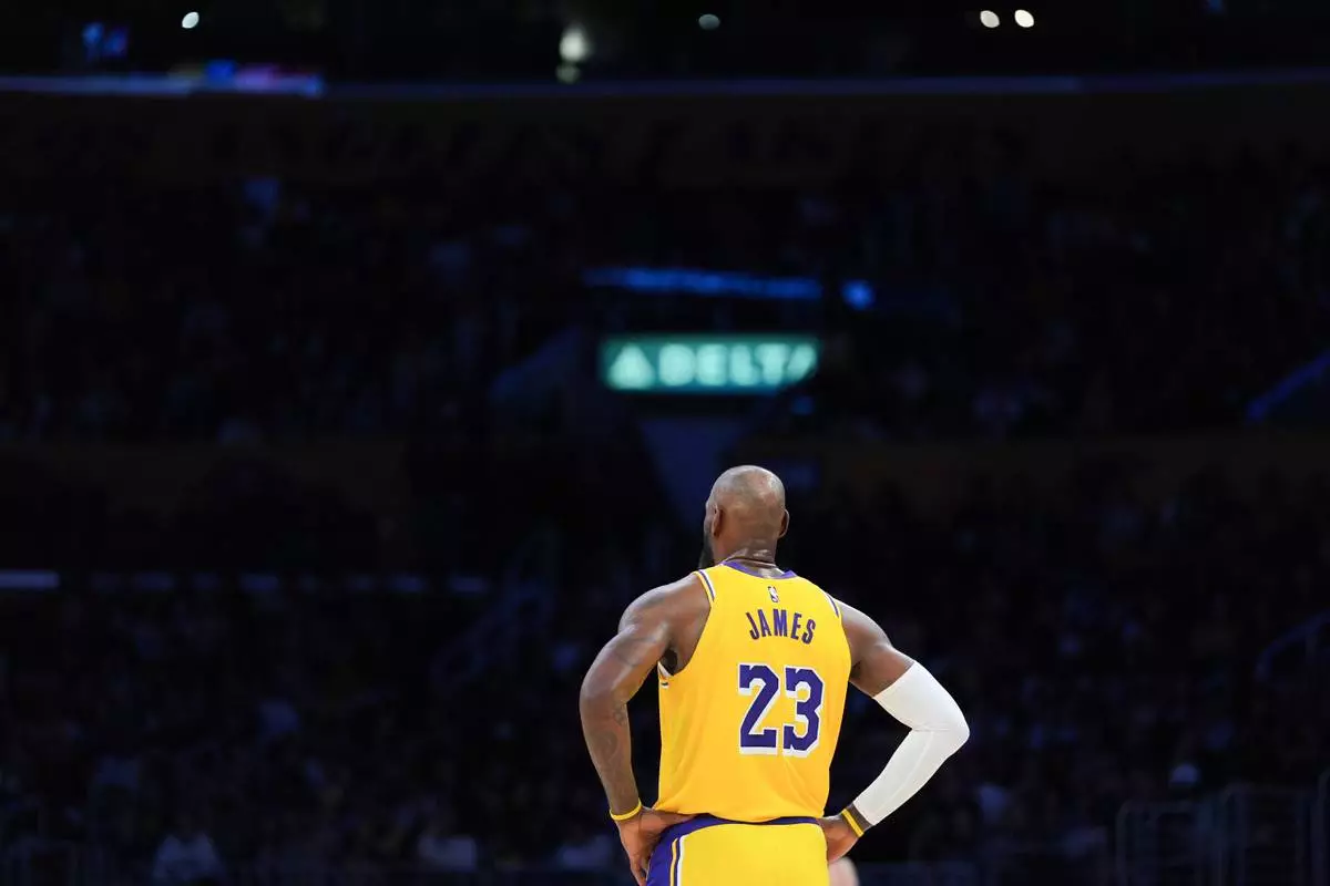 Los Angeles Lakers forward LeBron James (23) stands on the court during the first half of an NBA basketball game against the Golden State Warriors Saturday, Feb. 7, 2026, in Los Angeles. (AP Photo/Jae C. Hong)