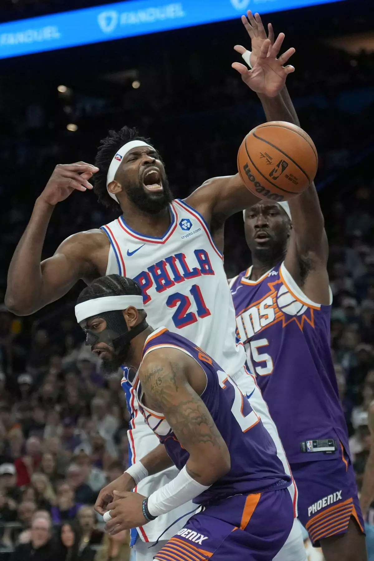 Embiid grabbed nine rebounds, made four 3-pointers and was 11 of 13 on free throws, all while jawing for much of the game with Suns forward Dillon Brooks. Formr Sun Kelly Oubre Jr. finished with 18 points.