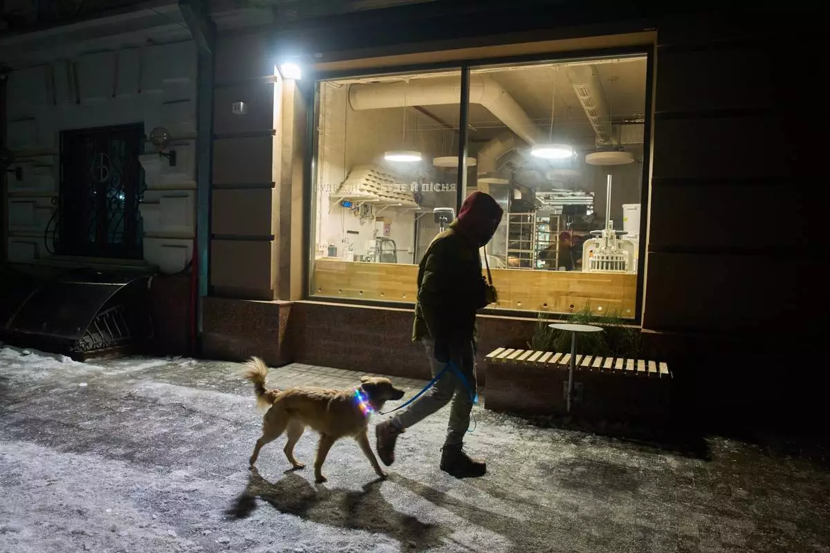 A man passes by a bakery in the early hours Friday, Jan. 30, 2026, in Kyiv. (AP Photo/Efrem Lukatsky)