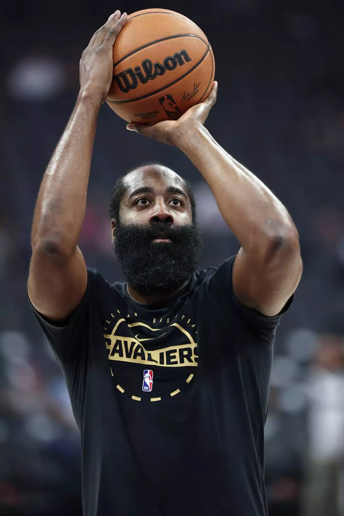 Cleveland Cavaliers guard James Harden warms up before an NBA basketball game against the Sacramento Kings Saturday, Feb. 7, 2026, in Sacramento, Calif. (AP Photo/Sara Nevis)