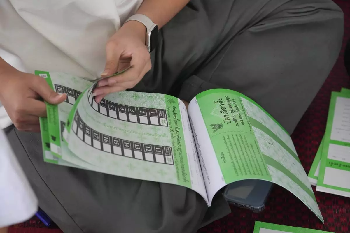 A volunteer checks ballots for Sunday's general election in Bangkok, Thailand, Saturday, Feb. 7, 2026. (AP Photo/Sakchai Lalit)