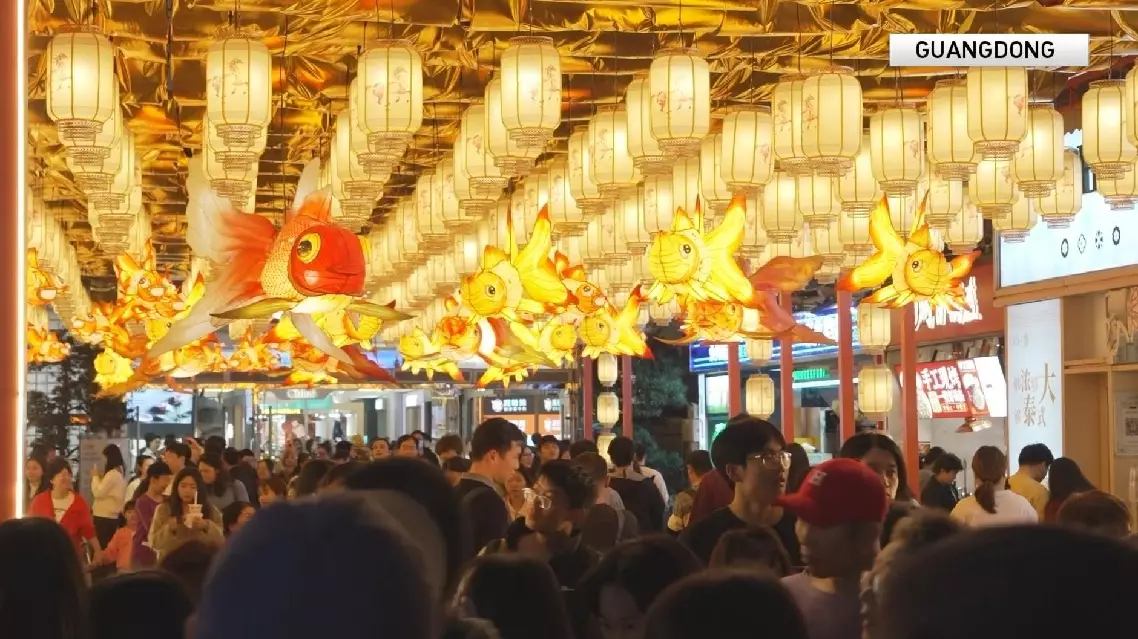 Business districts in Guangzhou City, in southern China's Guangdong Province, have adorned their streets with 5,000 lanterns themed with the Year of the Horse. They are showcasing captivating Hanfu performances, celebrating traditional Chinese culture and adding a festive flair to the atmosphere.