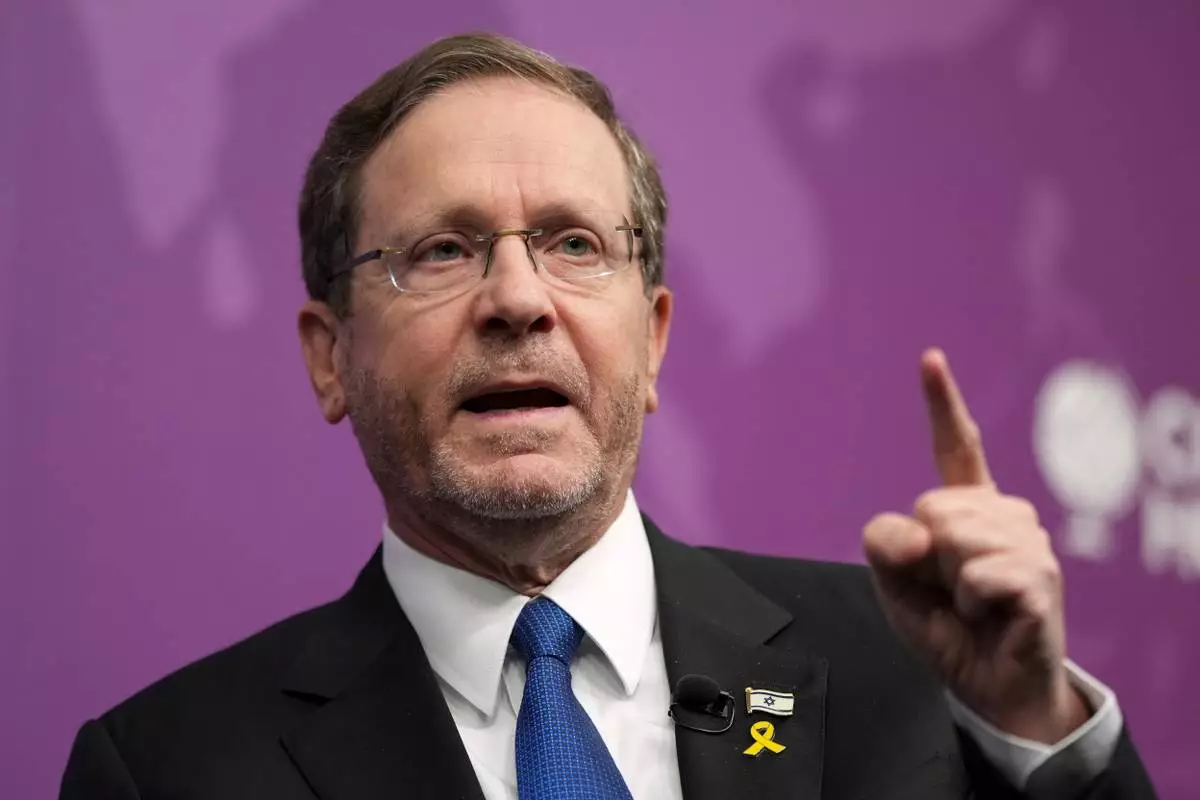 FILE - Israel's President Isaac Herzog gestures as he speaks at an event called 'In conversation with Isaac Herzog' at Chatham House in London, Sept. 10, 2025. (AP Photo/Alastair Grant, Pool, File)