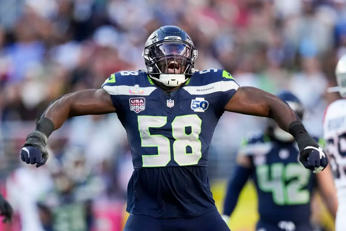 Seattle Seahawks linebacker Derick Hall (58) celebrates after sacking New England Patriots quarterback Drake Maye during the first half of the NFL Super Bowl 60 football game, Sunday, Feb. 8, 2026, in Santa Clara, Calif. (AP Photo/Morry Gash)