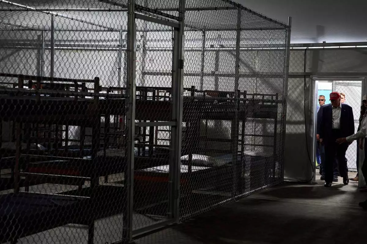 FILE - President Donald Trump tours "Alligator Alcatraz," a new migrant detention facility at Dade-Collier Training and Transition facility, on July 1, 2025, in Ochopee, Fla. (AP Photo/Evan Vucci, File)