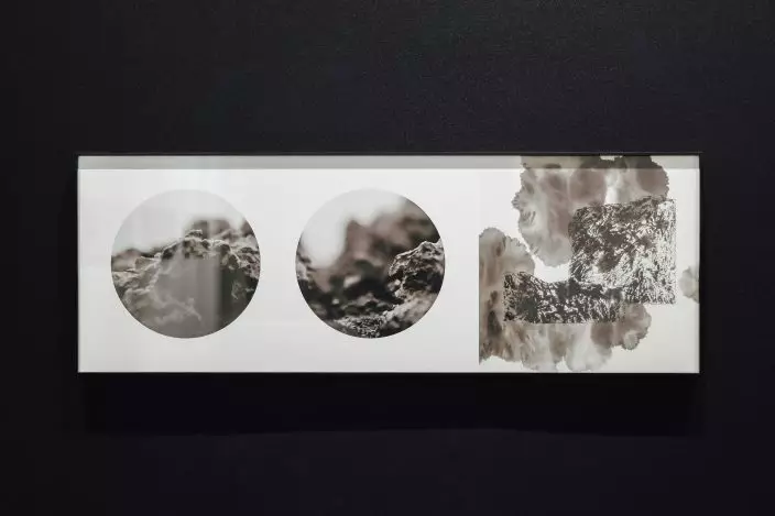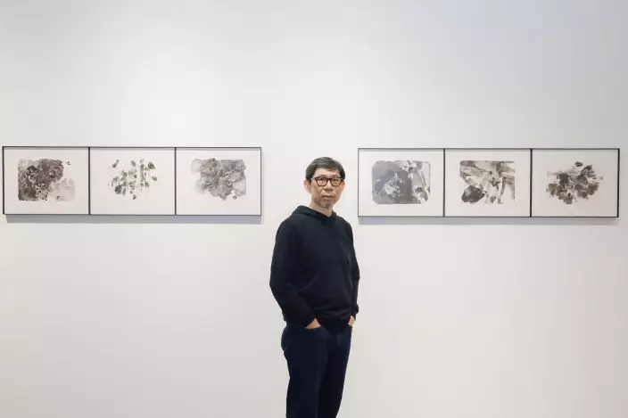 Ng's artwork at the exhibition integrates different media, including contemporary ink painting, acrylics, and photography. His ink art "A Stone's Dream" series narrates the dreams of a stone, and unfolds the artist's reflections on each stage of life. In the "Transcending Nature" series, Ng breaks from the tradition of using ink and paper in Chinese landscape painting, instead employing acrylics and canvas to capture the forms and spirit of mountains and rivers. The photography series "Transcend" shows the artist juxtaposing paintings and photographic artworks from different periods, with one part featuring cement blocks collected from construction sites to create dynamic photographs, while another part reveals their inherent vitality through flowing brushwork.