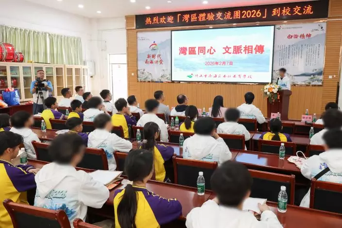To further cultivate national consciousness and positive values in young rehabilitated persons, correctional officers led youths who have completed their sentences and are under statutory supervision to participate in the Greater Bay Area Experience Exchange Tour 2026, visiting Foshan and Zhuhai in the Guangdong-Hong Kong-Macao Greater Bay Area for three days and two nights of exchanges, so that they could learn about the country's history and culture as well as its developments in various fields. Photo shows young rehabilitated persons visiting a school in Foshan on February 7, during which a young rehabilitated person shared his rehabilitation experiences. Source: HKSAR Government Press Releases