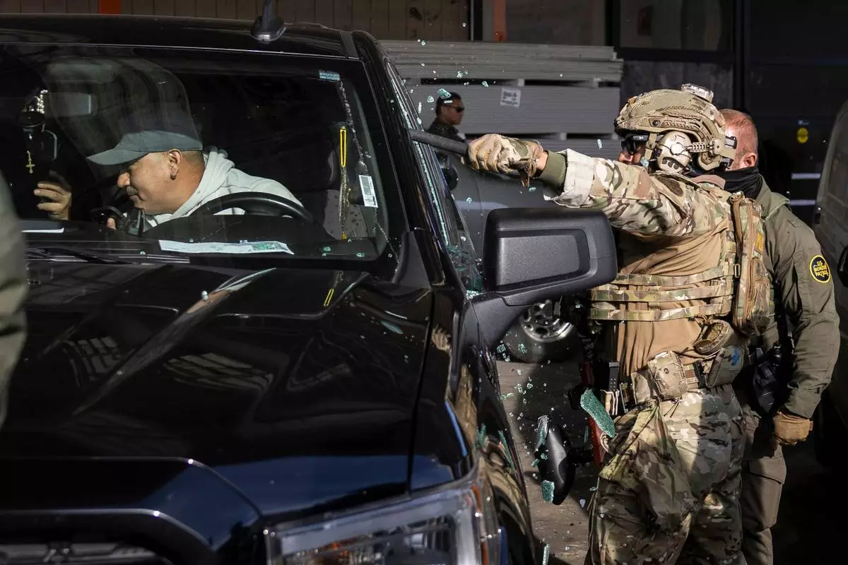 FILE - Federal immigration enforcement agents shatter a truck window and detain two men outside a Home Depot in Evanston, Ill., Dec. 17, 2025. (Ashlee Rezin/Chicago Sun-Times via AP, File)