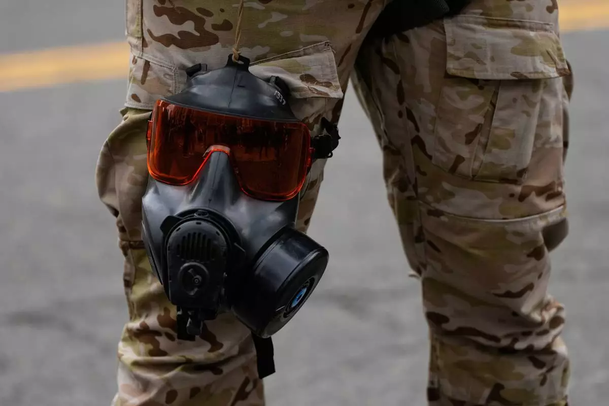 FILE - A gas mask and goggles are seen attached to a Customs and Border Protection officer's leg outside a U.S. Immigration and Customs Enforcement facility, Oct. 4, 2025, in Portland, Ore. (AP Photo/Jenny Kane, File)