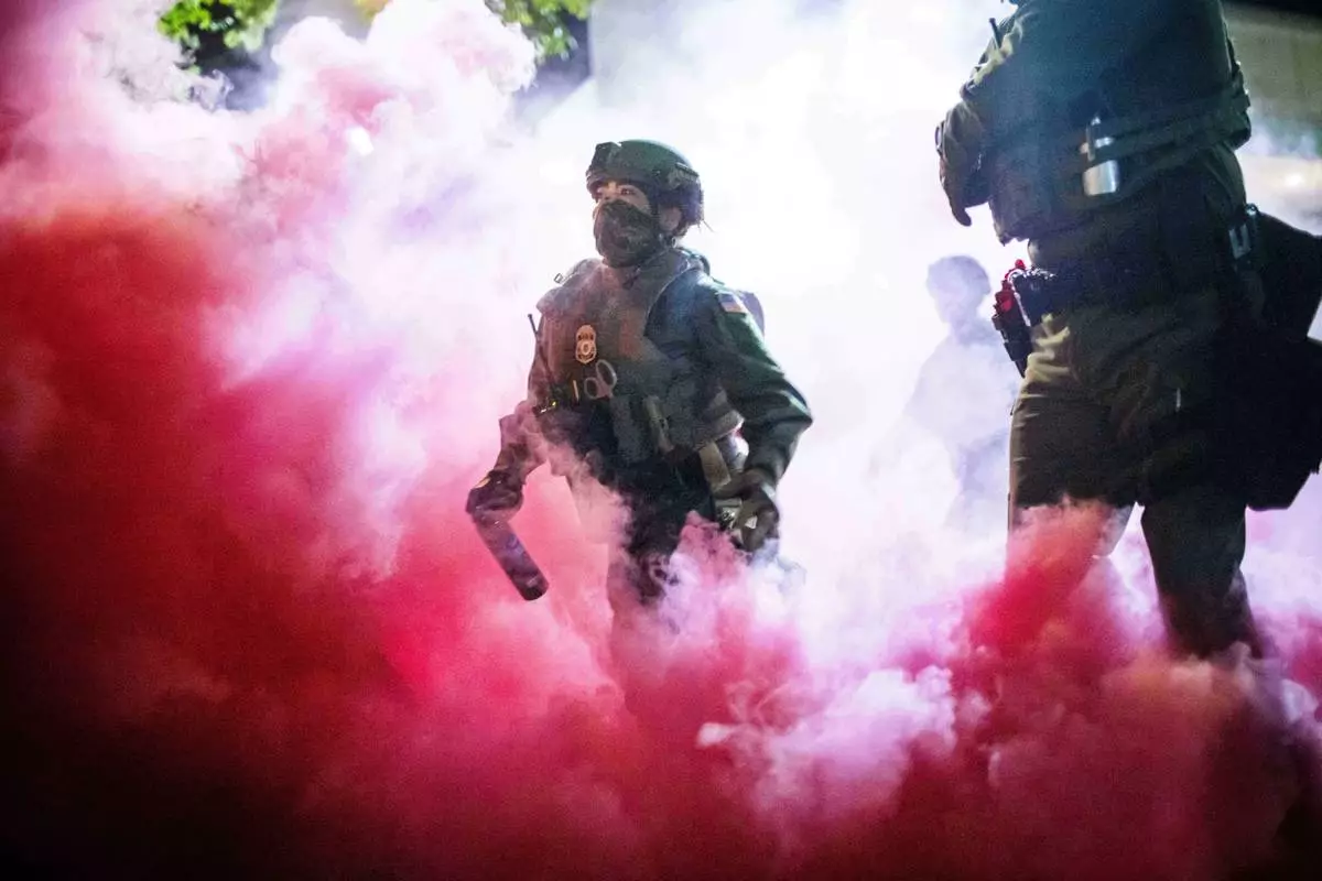 FILE - Police and federal officers throw gas canisters to disperse protesters near a U.S. Immigration and Customs Enforcement facility in Portland, Ore., Oct. 5, 2025. (AP Photo/Ethan Swope, File)
