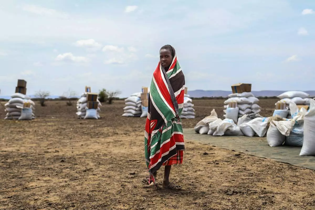 A child stands in front of food aid supplied by the World Food Programme (WFP) ahead of distribution in Nalemkais Village, Turkana County, Kenya, Sunday, Feb. 8, 2026. (AP Photo/Patrick Ngugi)