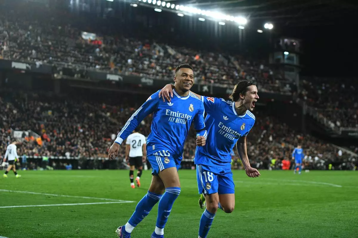 Real Madrid's Kylian Mbappe, left, celebrates with Alvaro Carreras after scoring his side's second goal during the Spanish La Liga soccer match between Valencia and Real Madrid in Valencia, Spain, Sunday, Feb. 8, 2026. (AP Photo/Francisco Macia)