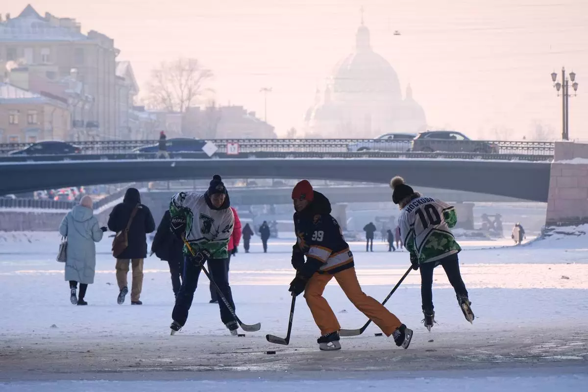 Members of a women's ice hockey team train on the frozen Fontanka River in St. Petersburg, Russia, Friday, Feb. 6, 2026. (AP Photo/Dmitri Lovetsky)
