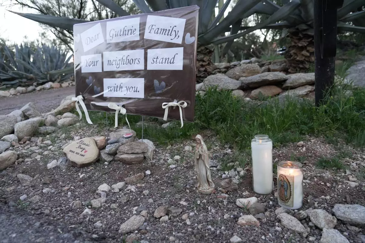 Lit candles next to a sign from neighbors supporting the Guthrie family outside of Nancy Guthrie’s house in the early morning hours of Sunday, Feb. 8, 2026 in Tucson, Ariz. (AP Photo/Ty ONeil)
