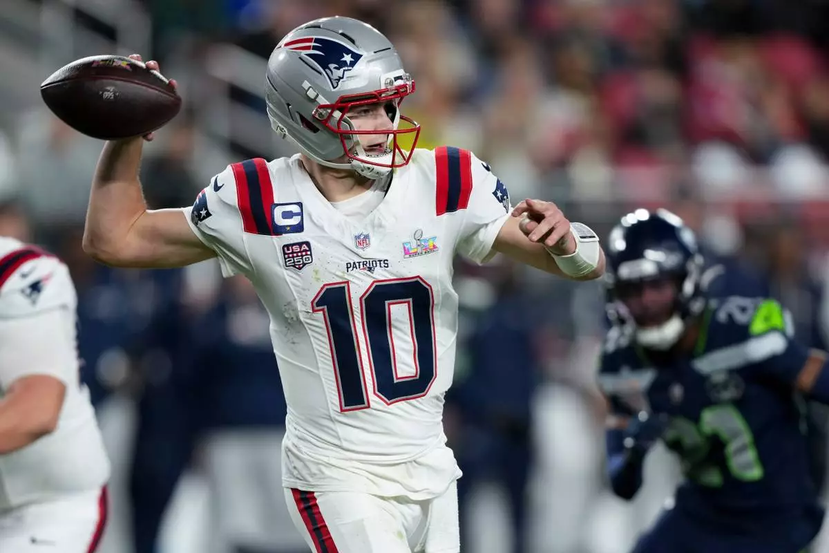New England Patriots quarterback Drake Maye (10) throws during the second half of the NFL Super Bowl 60 football game against the Seattle Seahawks, Sunday, Feb. 8, 2026, in Santa Clara, Calif. (AP Photo/Brynn Anderson)