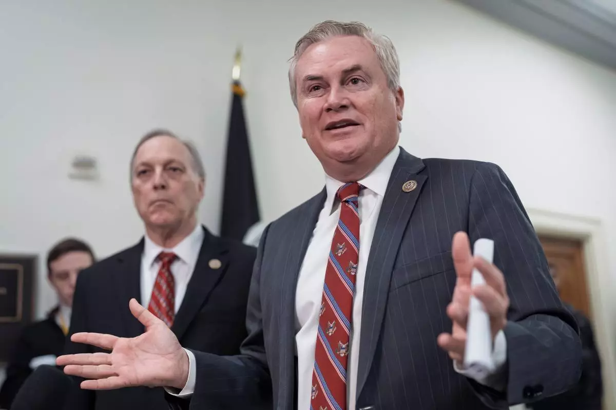 House Oversight Committee Chairman James Comer, R-Ky., joined at left by Rep. Andy Biggs, R-Ariz., speaks to reporters after a closed-circuit deposition with Ghislaine Maxwell, the former girlfriend and confidante of sex trafficker Jeffrey Epstein, at the Capitol in Washington, Monday, Feb. 9, 2026. (AP Photo/J. Scott Applewhite)