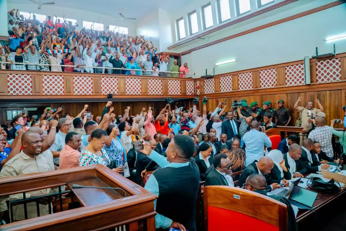 Main opposition leader Tundu Lissu, far right, gestures with supporters at the High Court of Tanzania as his treason trial continues before a three-judge bench in Dar es Salaam, Tanzania, Monday, Feb 9, 2026. (AP Photo/Florence Majani)