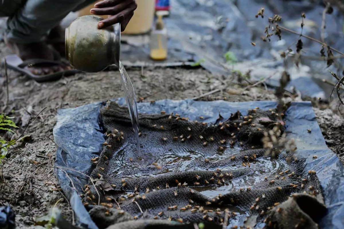 A migratory beekeeper pours water on a jute bag as bees come to drink near a mustard field in the Binnabari village in Baksa district of Assam, India, Thursday, Jan. 15, 2026. (AP Photo/Anupam Nath)
