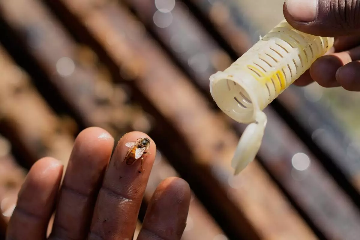 A migratory beekeeper prepares to keep a queen bee inside a container near a mustard field in the Binnabari village in Baksa district of Assam, India, Monday, Jan. 12, 2026. (AP Photo/Anupam Nath)