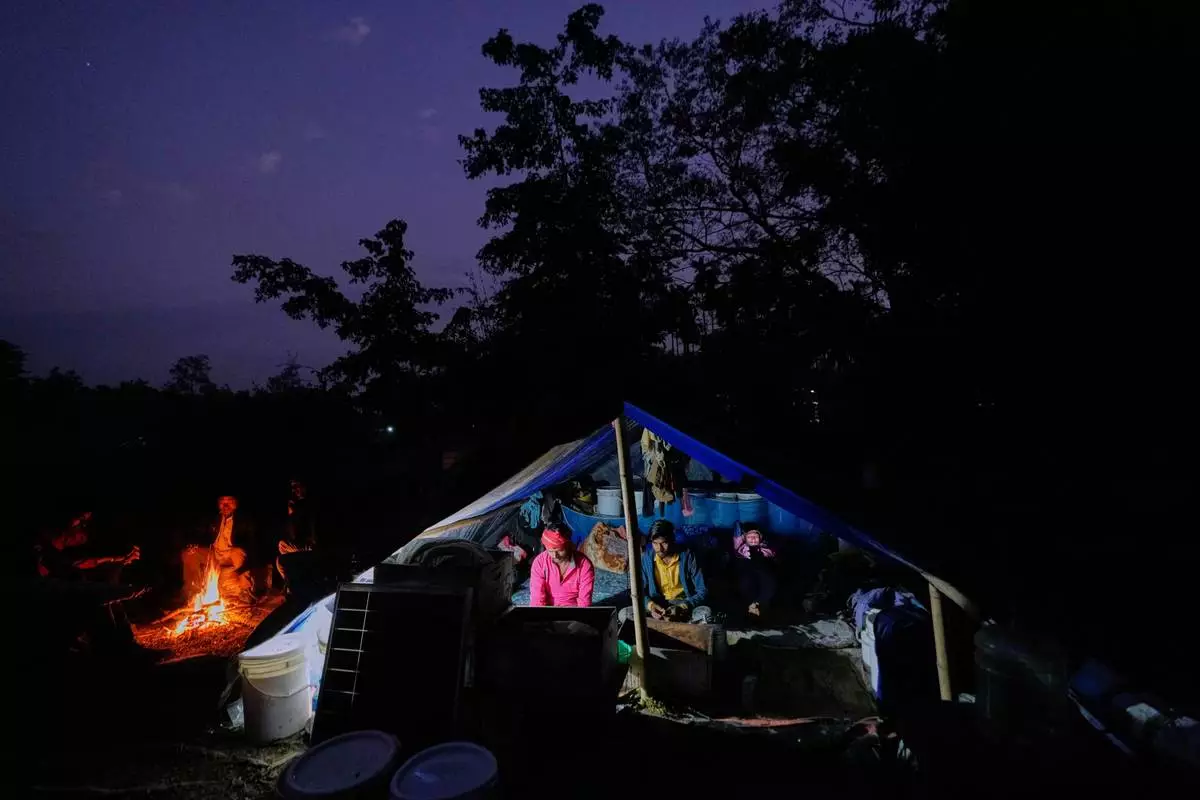 Migratory beekeepers sit in a makeshift tent at a bee colony near a mustard field in the Binnabari village in Baksa district of Assam, India, Thursday, Jan. 15, 2026. (AP Photo/Anupam Nath)